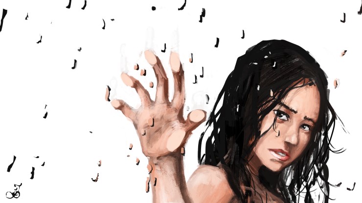고스란히 비 맞으며 울고 있는 미란.